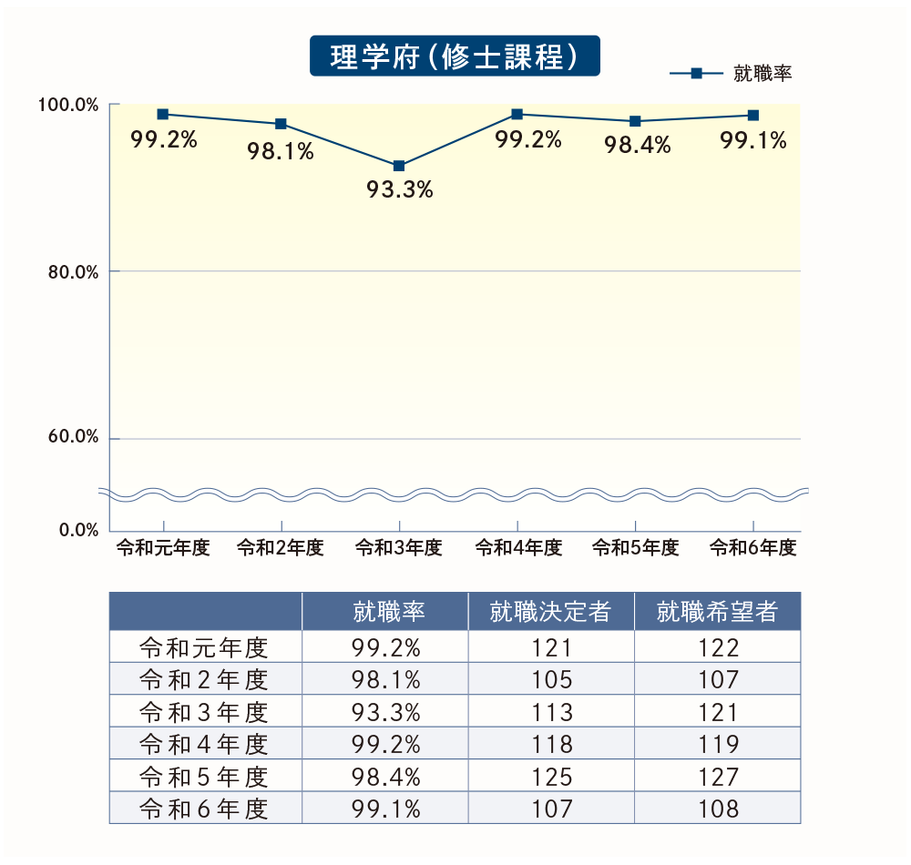 卒業生のうち、毎年約80%の者が「大学院修士課程」に進学していますが、進学率は年々増加する傾向にあります。進学する卒業生のうち、約90%は本学の「理学府」、「数理学府」、「システム生命科学府」、「マス・フォア・イノベーション連係学府」及び「システム情報科学府」に進学しています。
