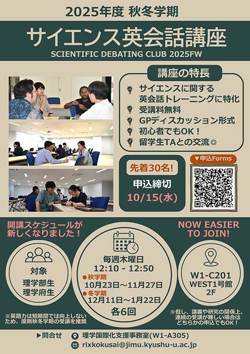 毎週木曜日の昼休み、12:10~12:50に、ウェスト1号館2階エントランスホール正面にあるW1-C-201で行います。TAとして留学生が参加してくれます。外国人と英語で「科学」について話す、という貴重な機会になるはずです。継続して参加することで、自信と度胸が身につくでしょう。
