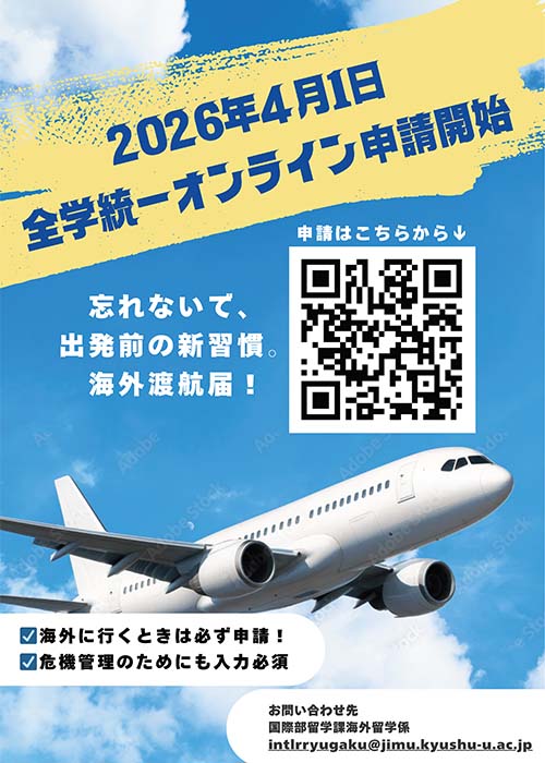 HOME > 国際交流・留学 > 九大生向け情報 > 海外へ渡航する場合の手続きについて