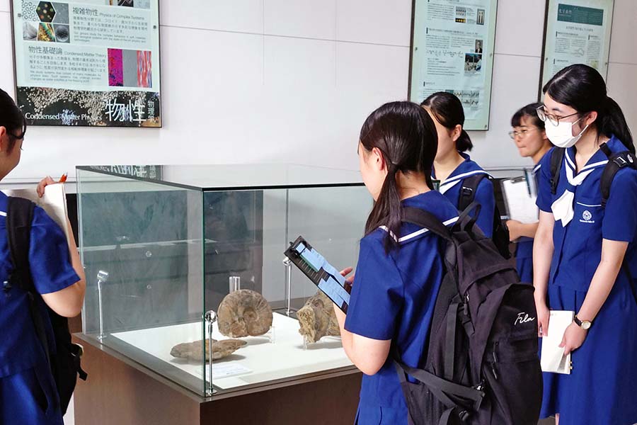 高校の授業では見ることができない貴重な標本や研究成果に係る資料に触れつつ、両教員の大学での学問や研究に係る話に熱心に耳を傾け、説明後に積極的に質問をする生徒も多く、今回の見学を通じ、大学での学問及び理学部の魅力を感じてもらいました。本取り組みは今年で3度目の実施であり、文理選択後の2年生へ今後の進路選択の一つの可能性として、理学部を考える一つのきっかけになったのではと感じます。