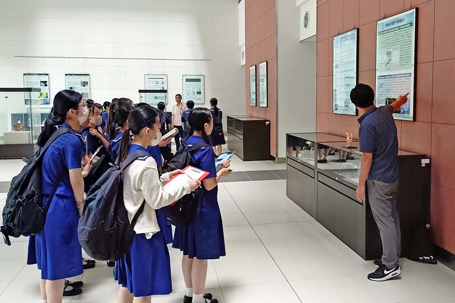 令和7年9月19日(金)、熊本信愛女学院高校特進コース2年生22名が九州大学理学部を訪問しました。ウエスト1号館正面入り口のエントランスホールには、理学部各学科が常設展示を行っており、当日は、地球惑星科学科 池田准教授、生物学科 熱田講師による各学科の研究内容等の説明を受けるとともに、各学科の展示物見学を行いました。