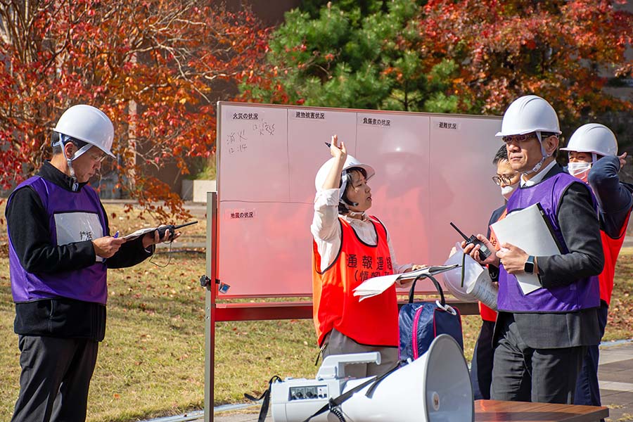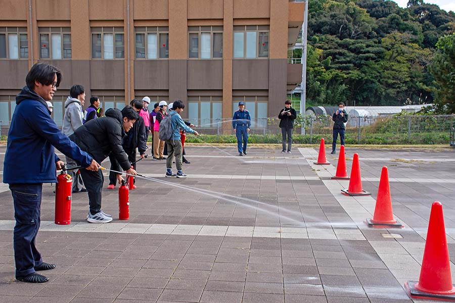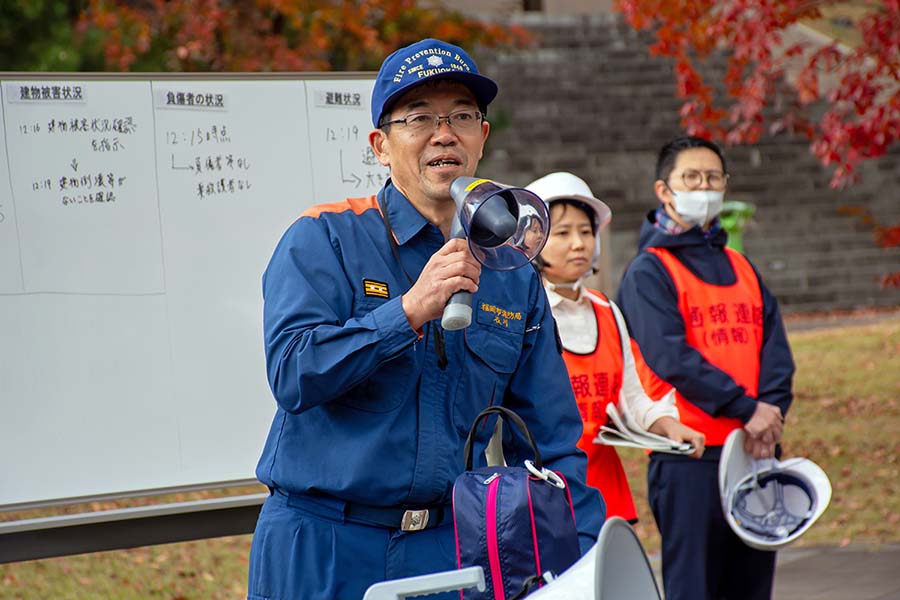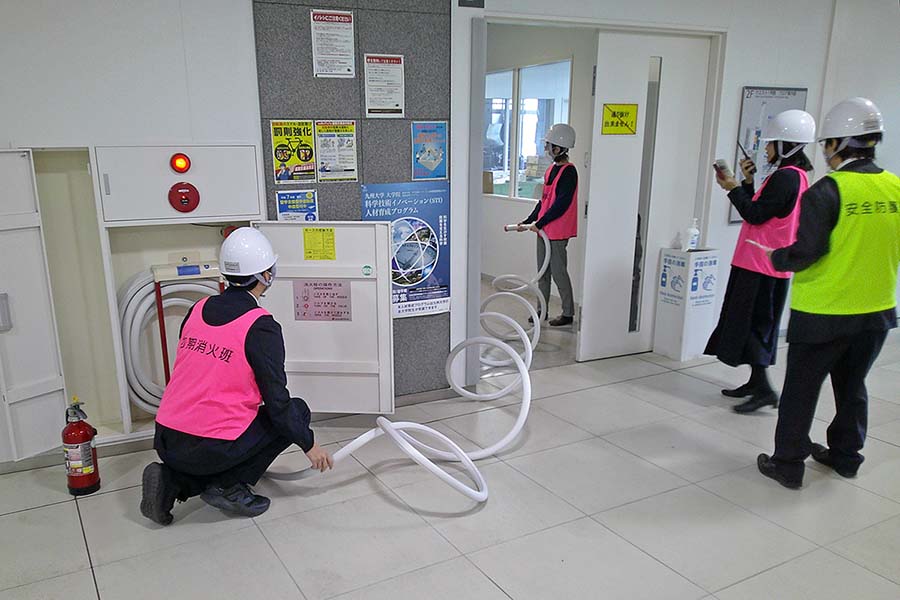 11月28日(金)、理学部等などで地震に伴う火災を想定した災害訓練を実施しました。教職員・学生あわせて約100名が参加し、災害時の対応を確認しました。