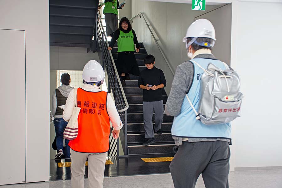 理学部等ではこれまで毎年消防訓練を行ってきましたが、昨年度からは訓練内容を大きく見直し、災害訓練として地震と火災の複合災害を想定した実践的な訓練を実施しています。