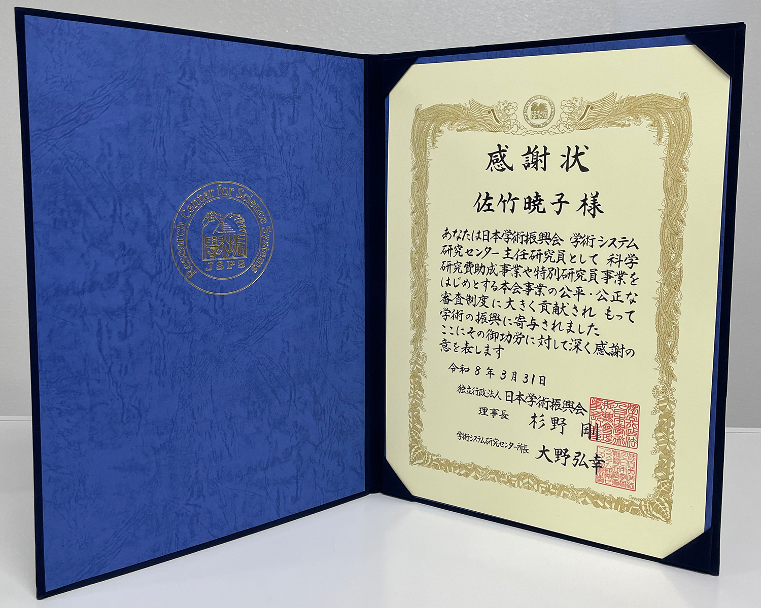 佐竹教授は、令和5年4月1日から令和8年3月31日まで、同センターの生物系科学専門調査班の主任研究員として科学研究費助成事業や特別研究員事業をはじめとする本会事業において、公平・公正な審査制度の運営に多大な貢献をされました。